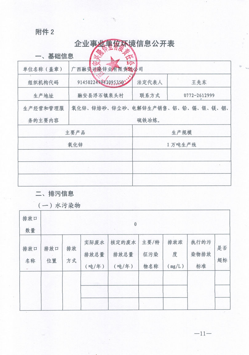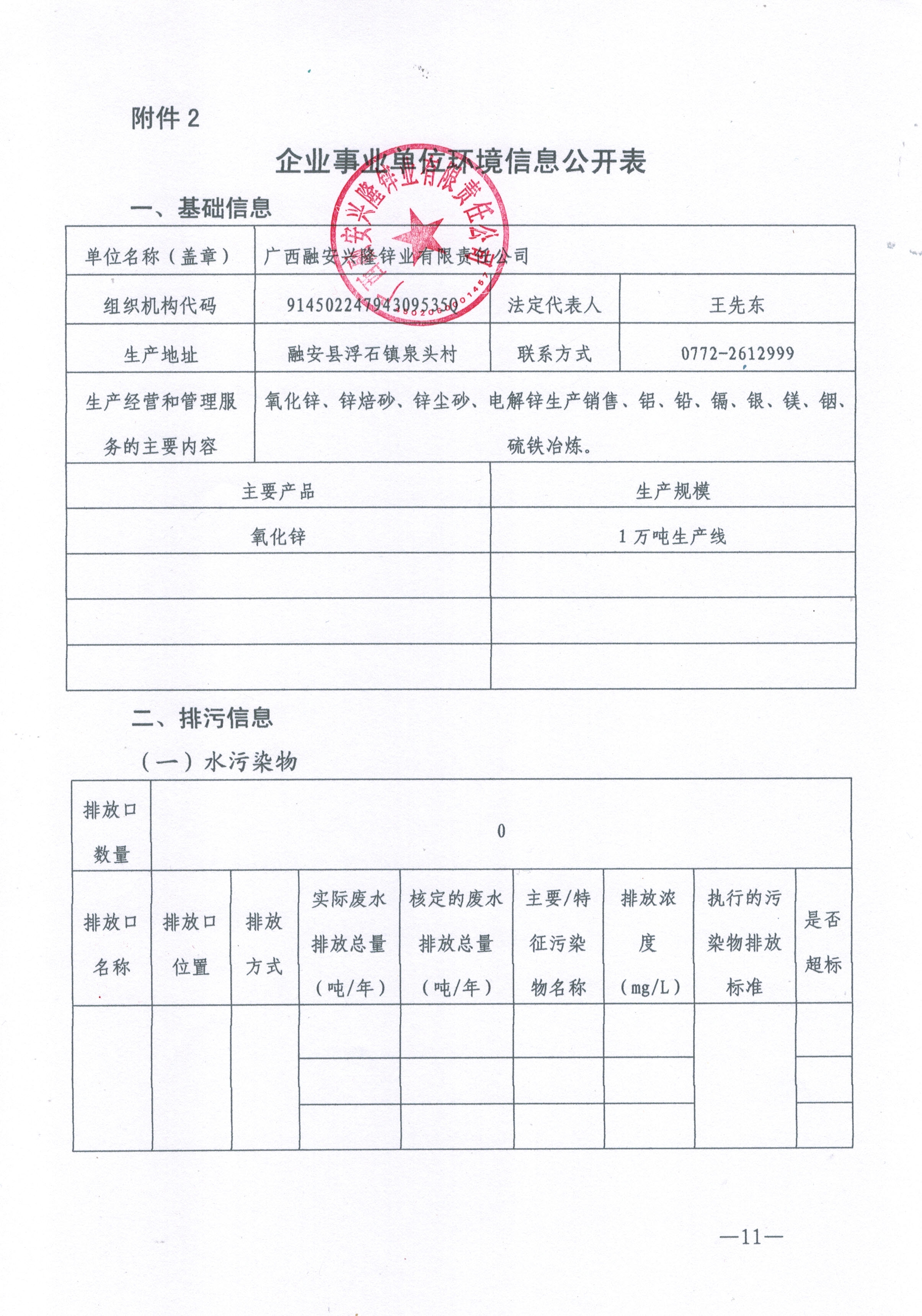 2018年广西融安兴隆锌业有限责任公司环境信息公开